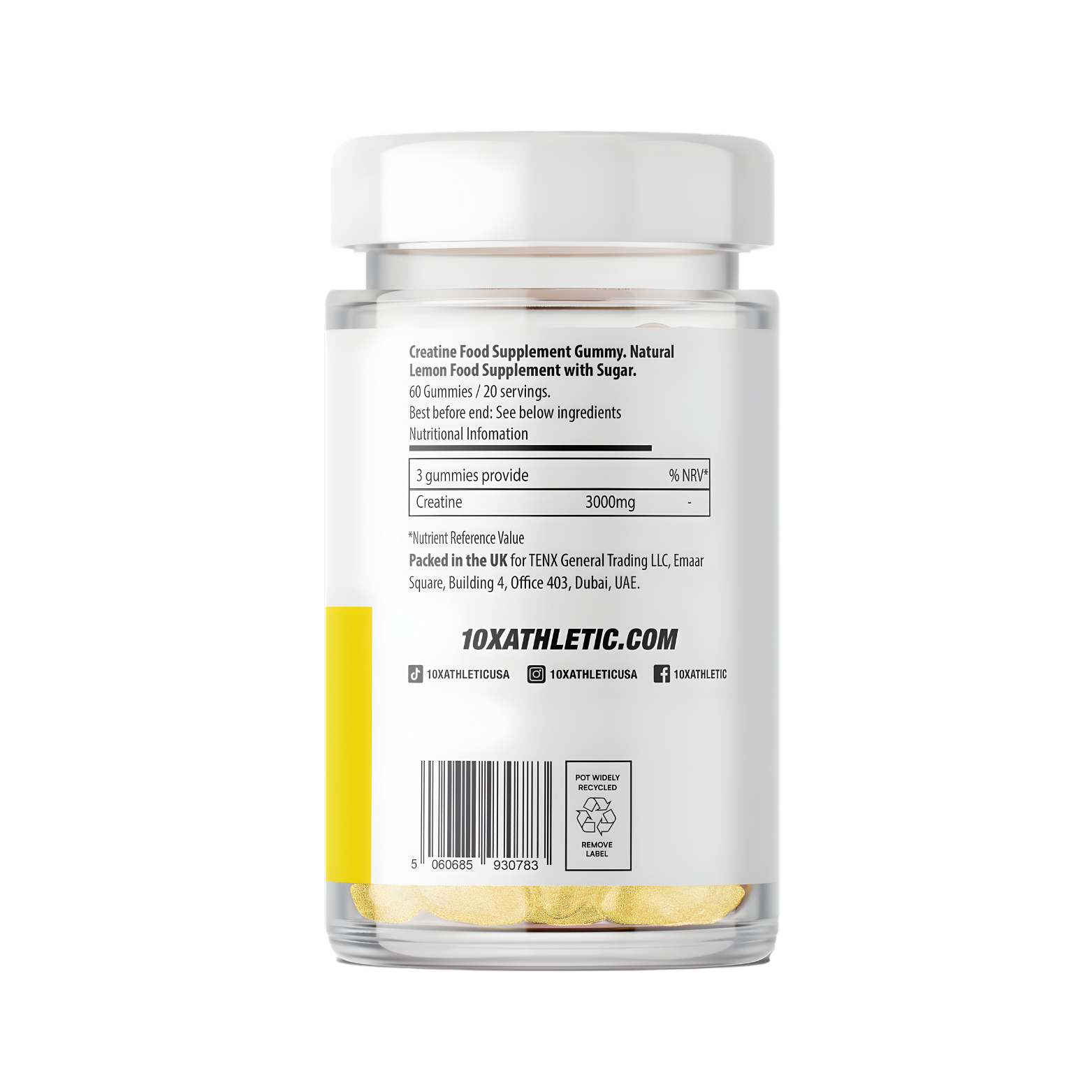 Creatine Monohydrate Gummies are a convenient, vegan-friendly supplement delivering pure creatine in an easy-to-consume format. Each gummy provides 1 g of creatine monohydrate in a natural lemon flavour, formulated without artificial flavours, colours, or preservatives. Designed to support both physical performance and cognitive function, the product is independently tested and manufactured to ISO and GMP standards in a certified facility.